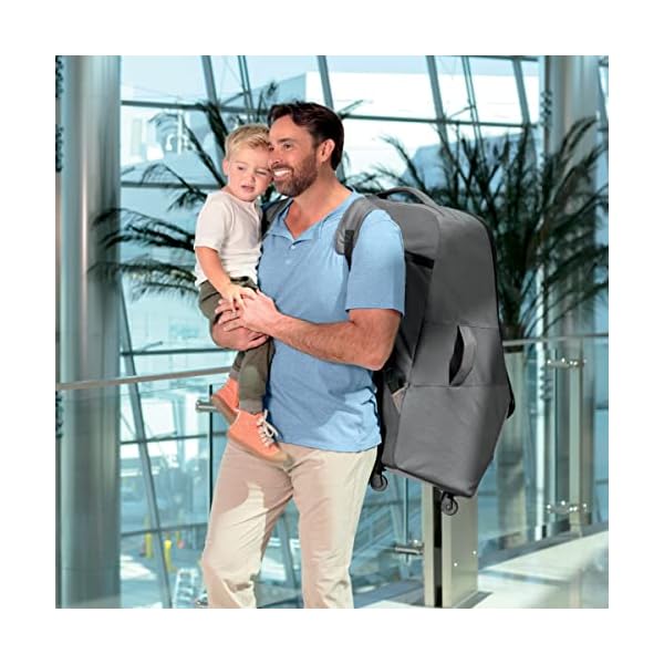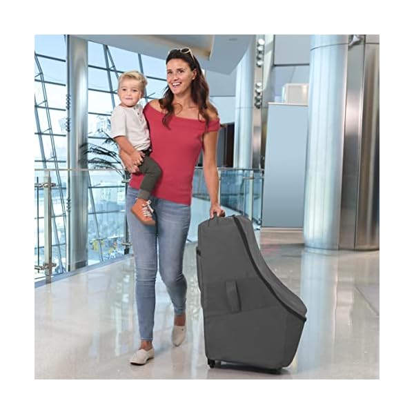 The Car Seat Travel Bag features a four-wheel spinner construction for smooth, easy maneuvering in all directions and two padded handles for comfortable lifting. Effortlessly roll the bag by your side with one hand or use the adjustable, padded backpack straps for convenient hands-free carrying. Durable, water-resistant fabric, sturdy double zippers and a reinforced rubberized base help protect the bag and car seat from the wear and tear of traveling.