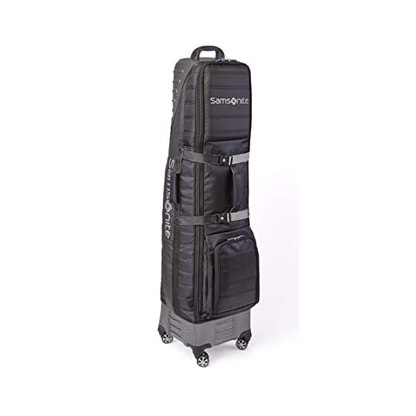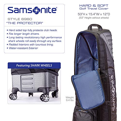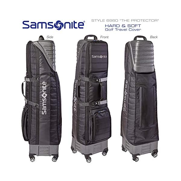 Injection-padded handles provide comfort when lifting it, and the Samsonite “The Protector” Hard and Soft Golf Travel Cover with Shark Wheels comes with multi-directional “SHARK” spinner wheels to glide effortlessly.