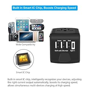 [Built-in Smart IC Chip]: SAUNORCH Universal Travel Adapter built in Smart IC Chip, intelligently recognizes your devices, adjusting the right current output automatically, boosts its charging speed, allow simultaneous charging your devices at high speed.