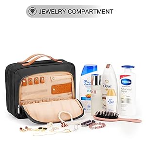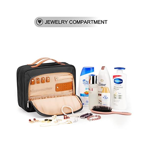GREAT ORGANIZER MASTER – This wash bag is designed with 4 toiletry storage compartments and a special jewelry compartment; you can easily put your wash products and jewelry separately to make your journey organized. The size of the fully-loaded state is 12.5”L x 6.5”W x 10”H, the 2 main compartments can hold up to 8 full-sized toiletries and cosmetics at the same time, no worries for long-distance travel.