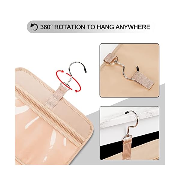 CONSIDERABLE DESIGN – The elastic bands inside the two main compartments can keep the different height bottles fixed and upright. Your comb, toothbrush, razor, and leak-prone makeup can all go in there, even a hair dryer. 360° metal hook gives you a variety of hanging options.