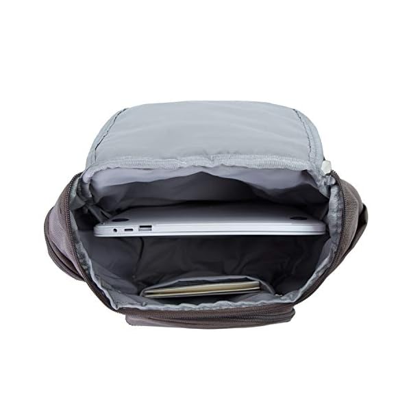 Top load backpack has padded sleeve for tablet or laptop up to 13”, slip pocket and zippered pocket